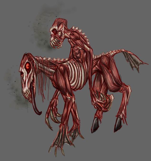 The spell control undead is one of the reasons everyone should be scared of necromancers, because necromancers voluntarily take these monstrosities into their heads. Corpsefiends are huge. They look like a skinless horse fused with their rider, constantly screaming in agony with bouts of insane laughter. They ride in herds, mostly keeping near the sea. They can even run on the surface of water. Other corpsefiends are the only creatures they will not hunt, maim, or kill for fun. In a never-proven theory, arcanologist Talindra Dorleth proposed that corpsefiends actually subsist on the impotent hopelessness of their victims. This would also explain their powers.