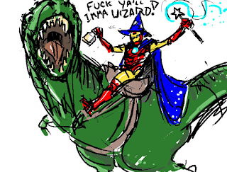 | This fanart is absolutely awesome. I can see the player, an elven wizard wearing an elven mithril-coat, a robe, a pair of gauntlets of power, a helmet (of brilliance?), a small shield, Magicbane and a pair of boots of water walking. He's using magic missile to kill the clone of the Wizard of Yendor, while the real Wizard is preparing to cast finger of death and has the Book of the Dead floating in front of him. There is a vampire (lord?), a gremlin, a cockatrice, a minotaur and a gold golem in the background. |